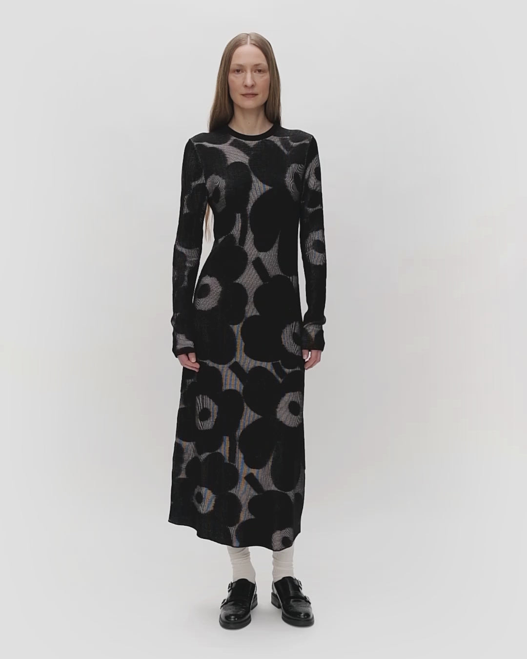 The Laatia knitted rib dress has a slim fit and a straight cut. The dress features the jacquard knit Unikko pattern, an O-neck, and long slim sleeves.