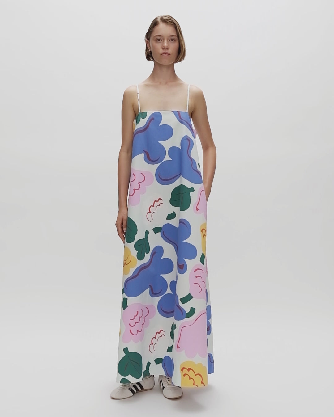 The Huvittaa dress has a slim A-line fit and it features the Kukasta Kukkaan pattern. The dress has short spaghetti straps a straight neckline and a concealed zipper in the left side seam. There is a central seam in the back.